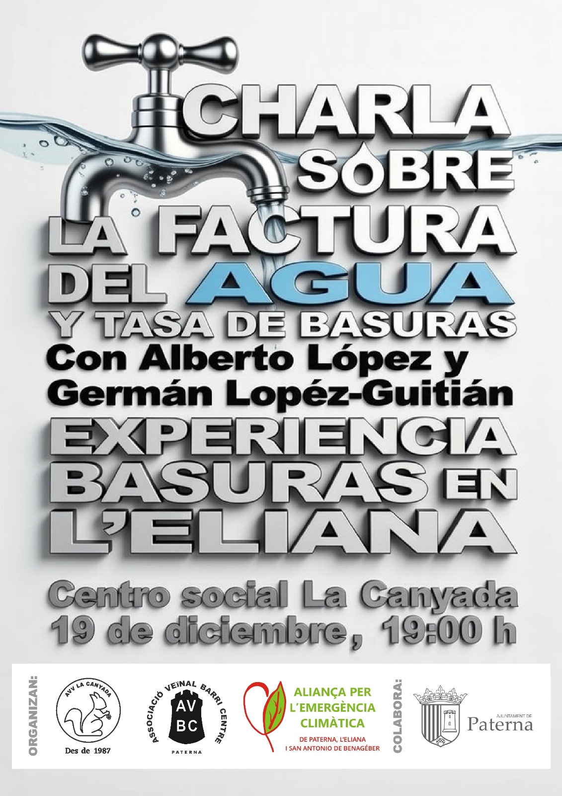 19 | 19:00 | Centro Social de La Canyada | Charla sobre la factura del agua y tasa de basuras.