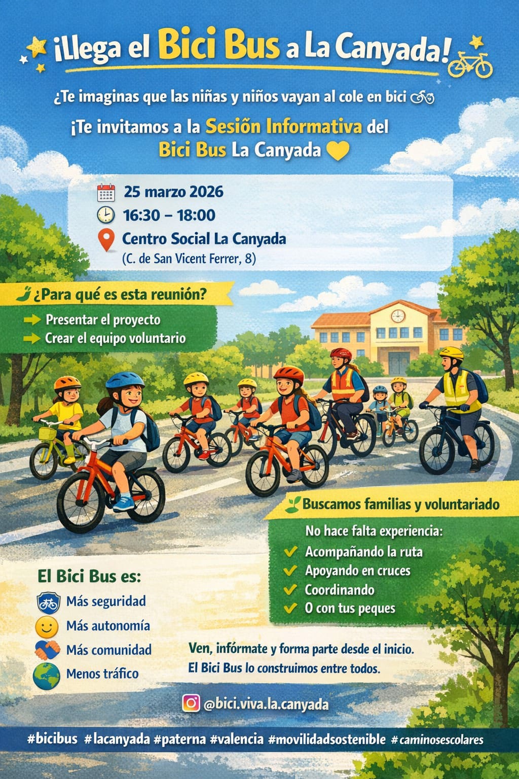 Se está intentando crear un grupo de voluntarios y familias para poder hacer un bici bus en La Canyada. Un bici bus es un grupo de alumnos que van juntos en grupo al colegio o instituto, en bicicleta, acompañados por adultos. Para más información, contacta con nosotros. Tienes aquí el cartel de la reunión informativa del 25 de Marzo de 2026.