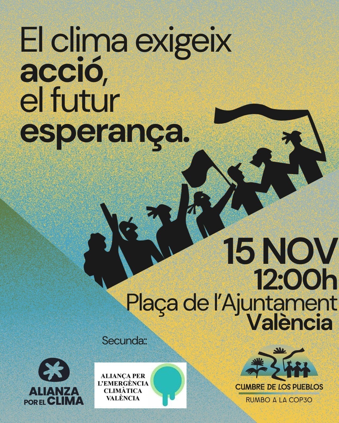 El 15 de Noviembre de 2025 participamos en la concentración organizada por la Alianza por el Clima, Alianza por la Emergencia Climática Valencia y Cumbre de los Pueblos en la Plaza del Ayuntamiento de Valencia, con motivo de la COP 30 de Brasil.