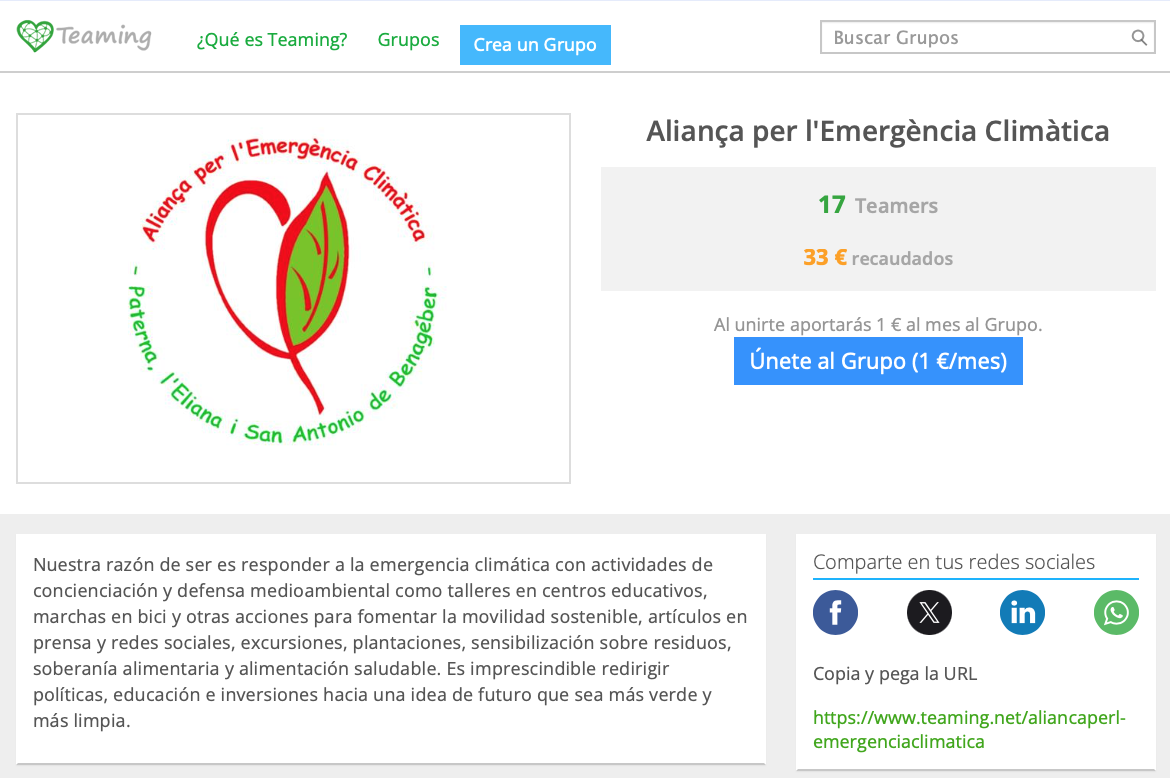 Teaming es una herramienta online que se utiliza para recaudar fondos en beneficio de causas sociales a través de micro donaciones. Si te unes al grupo, Teaming recoge 1€ cada mes de cada uno de los miembros. La idea es donar pequeñas cantidades pero contribuyendo muchas personas y de una forma constante.